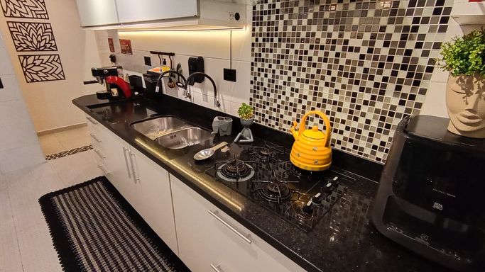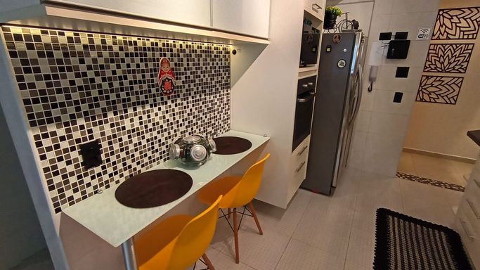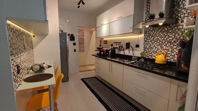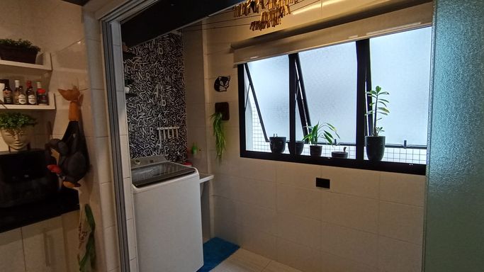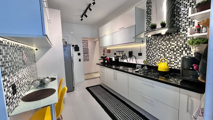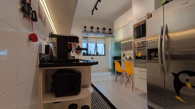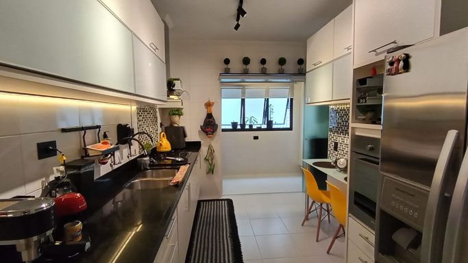 A cozinha é funcional e bem distribuída, conectada à lavanderia. O imóvel conta com 3 dormitórios, sendo 1 suíte. Um dos quartos foi originalmente dependência de serviço, mas passou por reforma completa e hoje está totalmente integrado ao padrão do apartamento, com ótimo acabamento e uso versátil. Ele fica posicionado próximo à cozinha e lavanderia, com banheiro ao lado, o que amplia ainda mais as possibilidades de uso, seja como dormitório, escritório ou apoio.