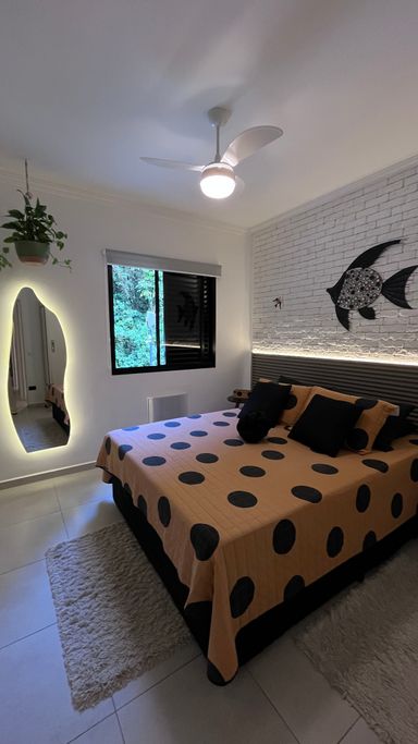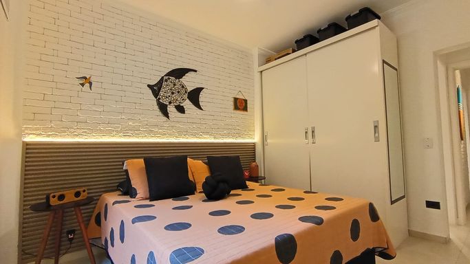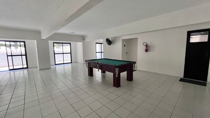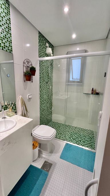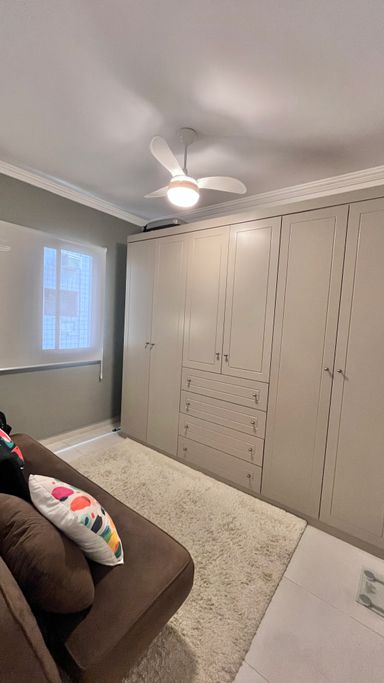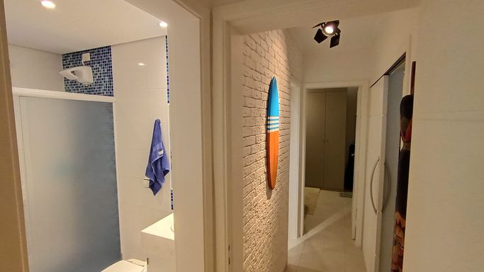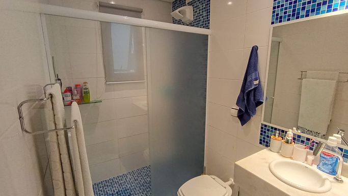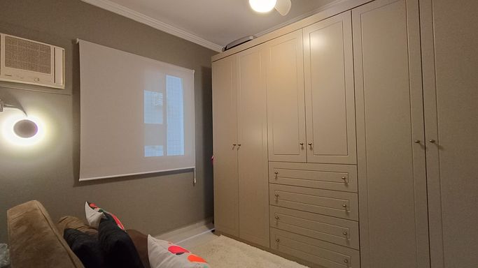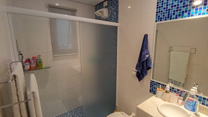 Os dormitórios oferecem conforto térmico com ventiladores de teto e ar-condicionado. O apartamento possui acabamento em cerâmica e box em vidro no banheiro. Conta também com vaga coletiva para até 2 carros.