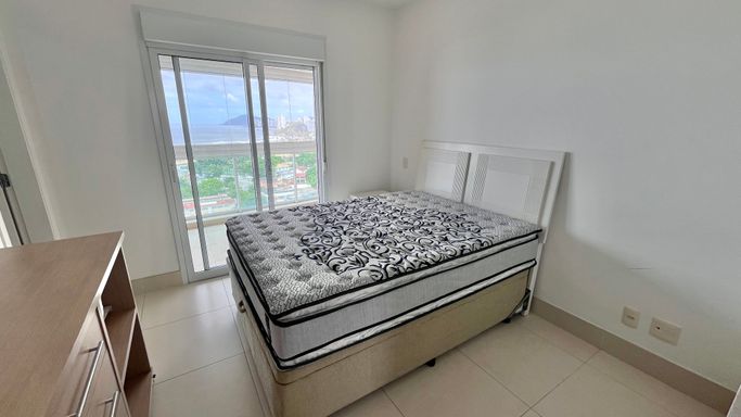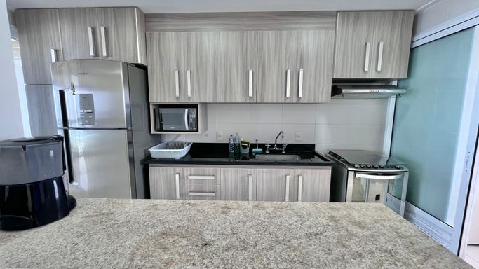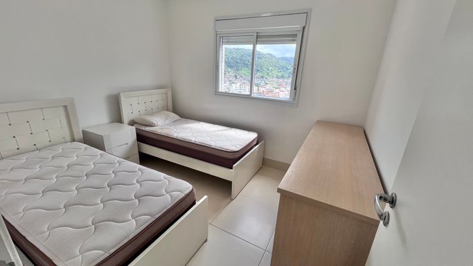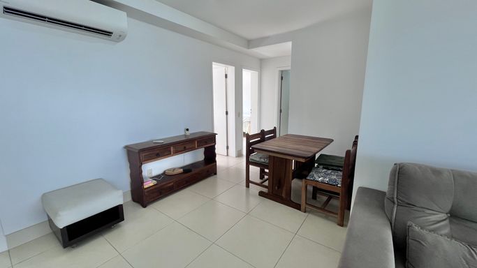 Apartamento reformado, pronto para morar, totalmente mobiliado, na Praia da Enseada, com vista para o mar e para as montanhas. Um cenário aberto, iluminado e muito agradável.