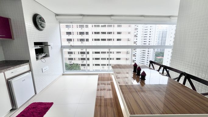 O imóvel conta com 3 dormitórios, sendo 1 suíte, além de 2 banheiros e 1 lavabo. Os ambientes são bem distribuídos, com sala confortável equipada com ar-condicionado, assim como dois dos quartos. A varanda gourmet, fechada em vidro, é um dos destaques, ideal para momentos de convivência com família e amigos.