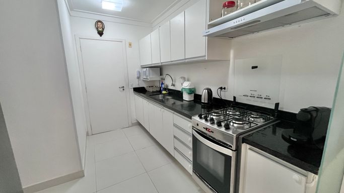 A cozinha em estilo padrão, junto à área de serviço, atende perfeitamente às necessidades do dia a dia.