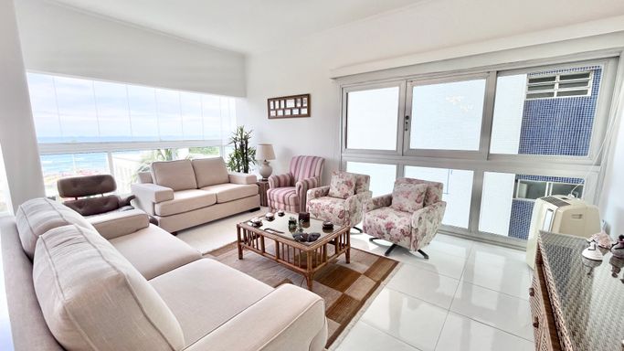 Apartamento de frente para o mar, com vista panorâmica e excelente iluminação e ventilação natural em todos os ambientes. Conta com 3 dormitórios, sendo 1 suíte com sacada lateral e vista para o mar. Todos os quartos possuem vista lateral para a praia e armários embutidos. A suíte principal tem ar-condicionado, enquanto os outros dois dormitórios contam com ventilador de teto e ar-condicionado, garantindo conforto no dia a dia. A área social é integrada, com sala ampla climatizada e conectada à cozinha americana, criando um ambiente moderno, funcional e ideal para o convívio. A sacada amplia ainda mais a experiência, trazendo o mar como parte do cenário. São 3 banheiros no total, incluindo a suíte, todos com box. Tanto o banheiro social quanto o da suíte possuem banheira e acabamento com detalhes dourados. A cozinha americana é prática e bem distribuída, com acesso à lavanderia. O piso em cerâmica facilita a manutenção. Localizado na Praia das Pitangueiras, na Barra Funda, próximo ao comércio local e bons restaurantes, é uma excelente opção para quem busca vista para o mar e praticidade.