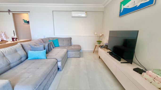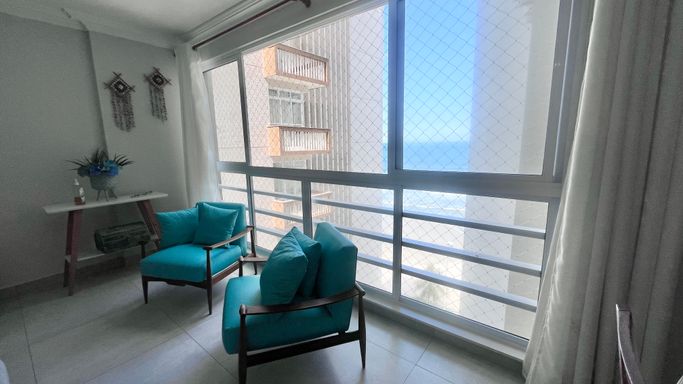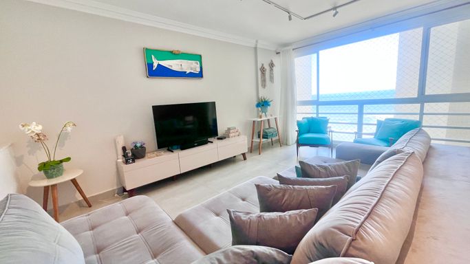 Em prédio frente mar, este apartamento se destaca logo na chegada pela vista lateral para o mar, trazendo luminosidade, ventilação e o clima do litoral para o dia a dia.