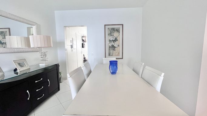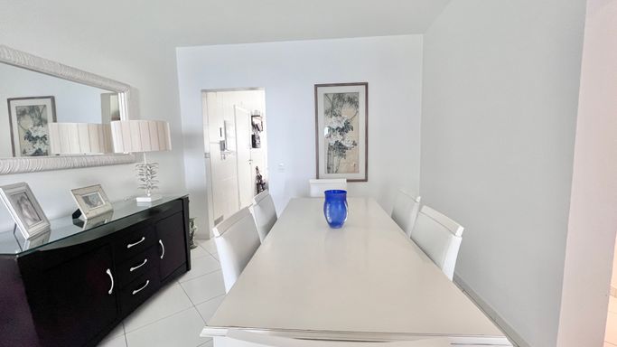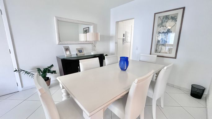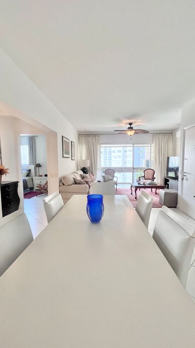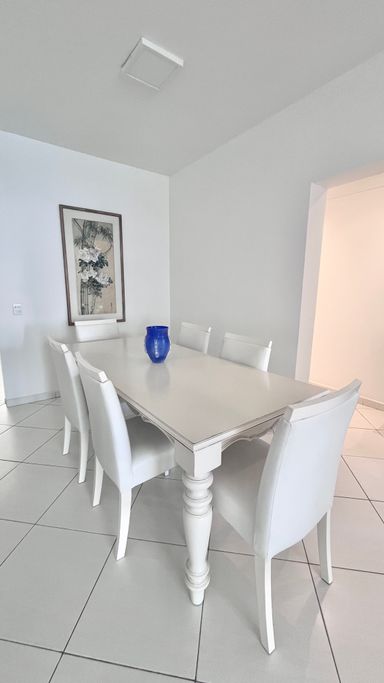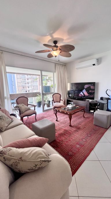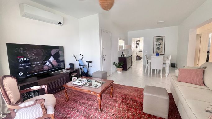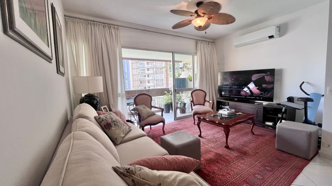 A sala de estar e jantar são integradas, criando um ambiente confortável e bem distribuído, com ar-condicionado e ventilador de teto. A varanda complementa o espaço e traz ainda mais ventilação.