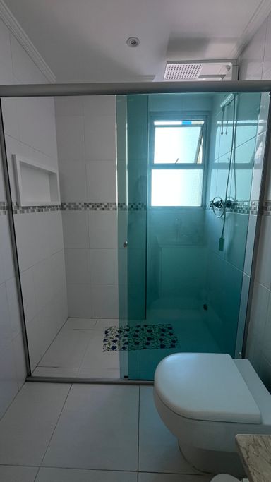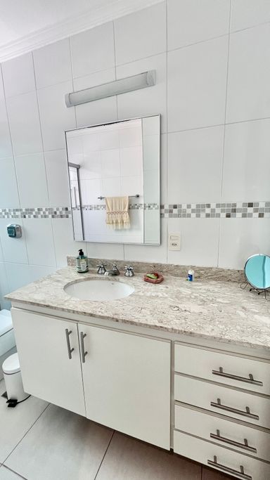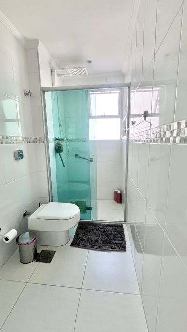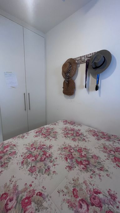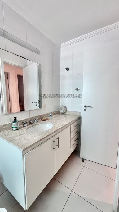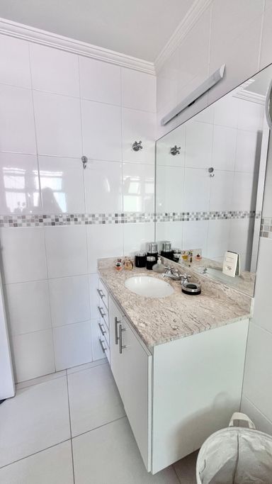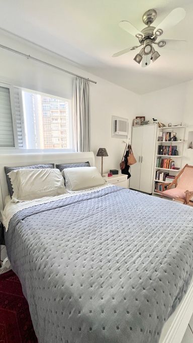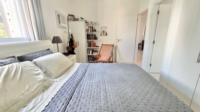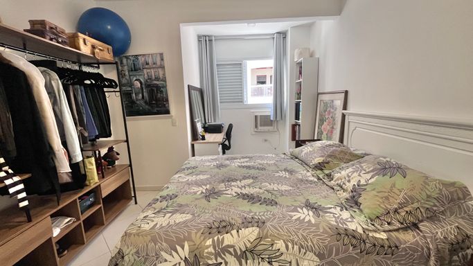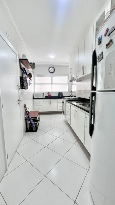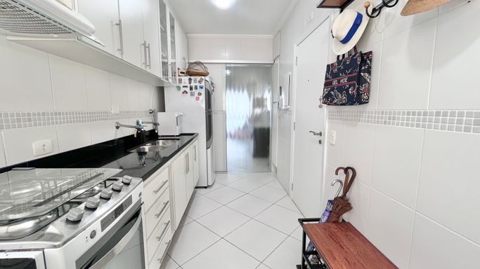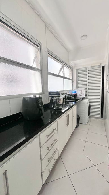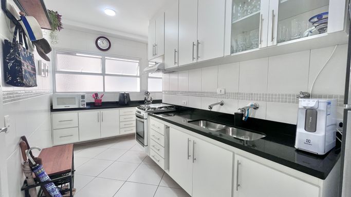 A cozinha conta com armários e boa funcionalidade no dia a dia. O imóvel possui 3 dormitórios, sendo 1 suíte. A suíte conta com ar-condicionado, um dos quartos também possui ar-condicionado e o terceiro conta com ventilador. No total, são 3 banheiros, incluindo o de serviço.
