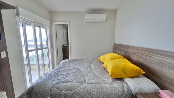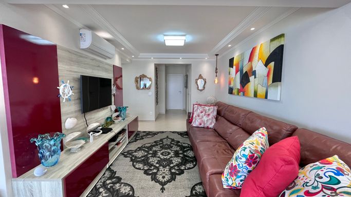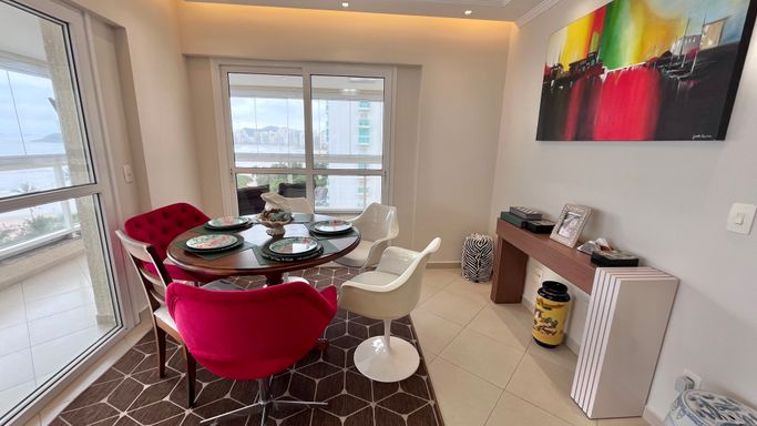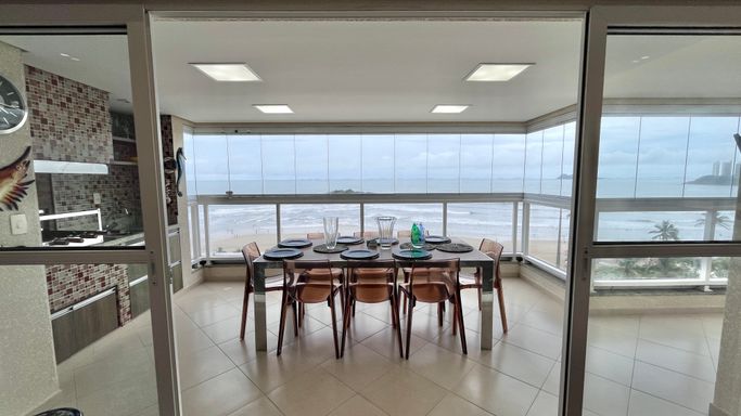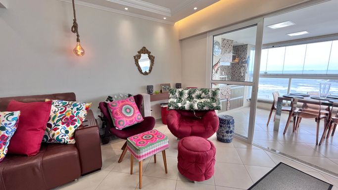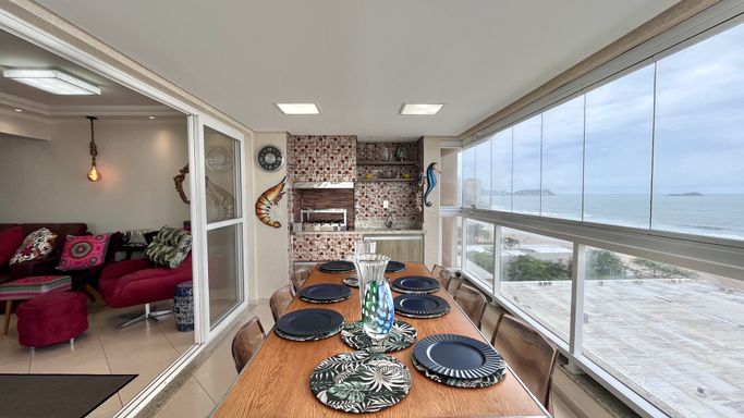 A sala espaçosa se integra à varanda gourmet com uma vista incrível para o mar, criando um ambiente perfeito para receber amigos e aproveitar momentos especiais com a família.